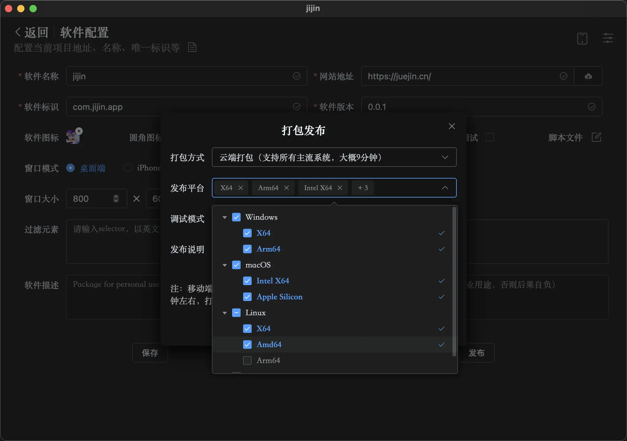 - 发布模式:关闭调试和开启调试,开启后,当软件启动时有问题可以在控制台看到错误信息,页面可以右键打开检查查看调试信息。